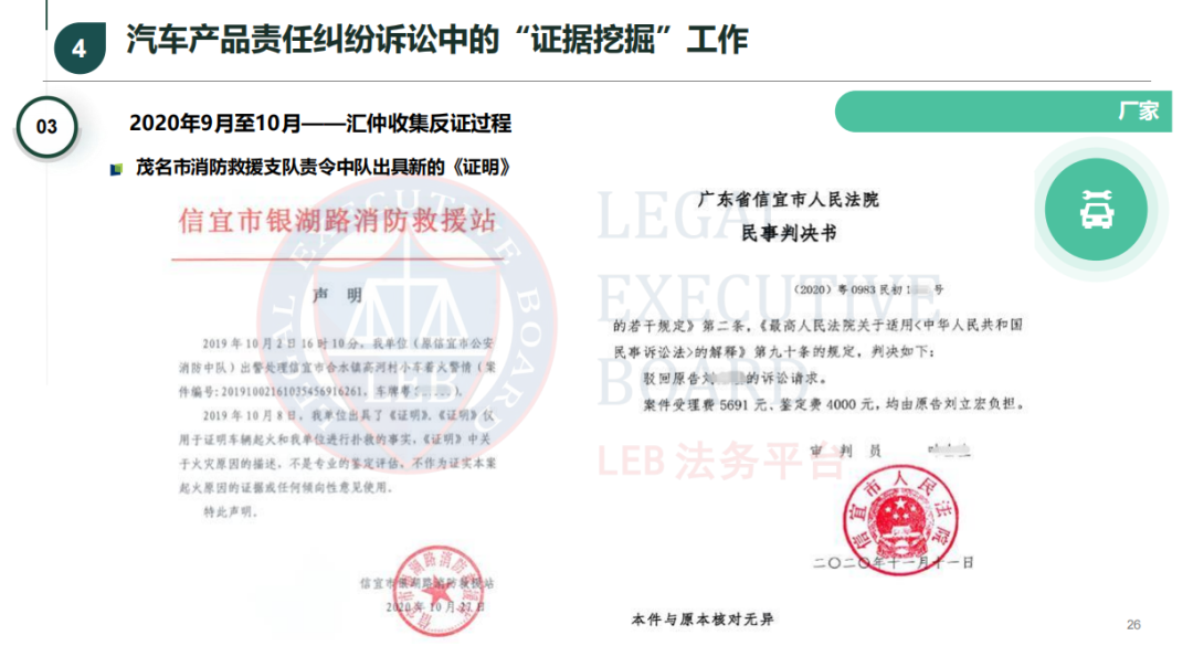 在汽车产品责任纠纷诉讼这个板块,两位律师结合自己多年工作经验,详解了多个实务案例,比如下文几页PPT就是一个充满着双方博弈和证据挖掘,斗智斗勇的应诉过程,深有启发。