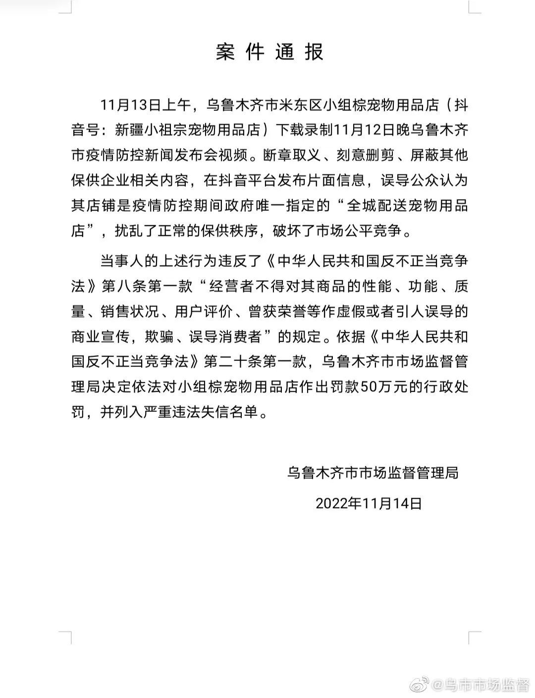 11月14日电 据乌鲁木齐市市场监督管理局官方微博消息,乌鲁木齐市市场监督管理局14日发布案件通报称,11月13日上午,乌鲁木齐市米东区小组棕宠物用品店(抖音号:新疆小祖宗宠物用品店)下载录制11月12日晚乌鲁木齐市疫情防控新闻发布会视频。断章取义、刻意删剪、屏蔽其他保供企业相关内容,在抖音平台发布片面信息,误导公众认为其店铺是疫情防控期间政府唯一指定的“全城配送宠物用品店”,扰乱了正常的保供秩序,破坏了市场公平竞争。